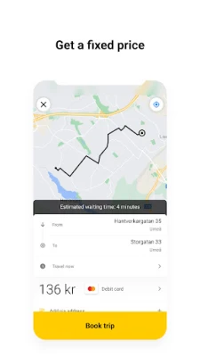 With the Umeå Taxi app you book your taxi with ease. You’ll always get a fixed price on your trips and you’re able to pay by card or PayPal in the app to make your ride as smooth as possible. We’ll notify you both when the taxi is on its way and when it has arrived. You can also follow your car on the map.