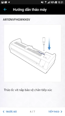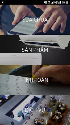 "Ứng dụng Samsung AC Support, nằm bên phải điện thoại của bạn, cung cấp kỹ thuật viên sửa chữa máy điều hòa cùng với thông tin và hướng dẫn sản phẩm máy điều hòa Samsung