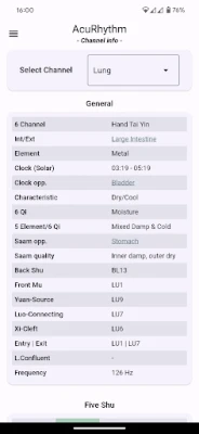 Other useful point information is given by Channel, including: Source, Luo, Xi-Cleft, 5 Shu, Entry/Exit, 5 Element techniques such as the 4 Needle Technique (Korean Sa-Am) , Dr Richard Tan's 5 Systems and Dr Chao Chen's Six Channel ZangFu Method, Manaka's Daily Biorhythmic phases.