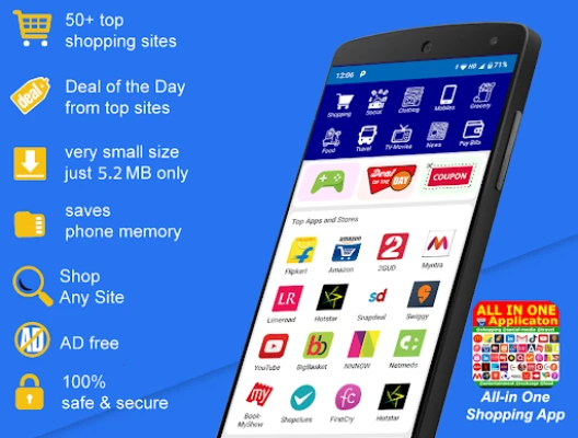 You can use Amazon, Flipkart, Snapdeal, Shopclues, Myntra & Ajio and many more top Indian shopping sites on one place. Checkout Daily Deals, Coupon codes and Handpicked Deals & Offers from top Shopping Sites with new All in One Shopping App - Best Shopping Deals 2020 , 2021, 2022 & 2023.