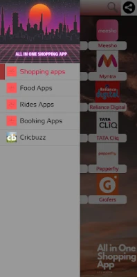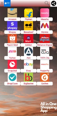 All in One Shopping app is a collection of Amazon, Flipkart, Shopsy, Jio Mart, Bewakoof, Snapdeal, TATA Cliq, Nykaa, Ajio, ShopClues, BigBasket, Grofers, Pepperfry, Ebay, Paytm Mall and Myntra app that gives you updates of fresh, newly arrived and trending products available across the globe.