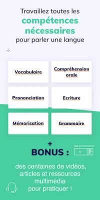 - Le cours est structuré et optimisé, et il contient différentes étapes d’apprentissage (écoute, prononciation, écriture, mémorisation )