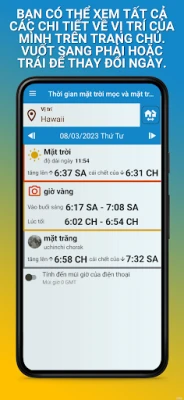 Với ứng dụng của chúng tôi, bạn có thể xem thời gian mặt trời mọc và mặt trời mọc cho từng địa điểm. Chúng tôi hiển thị cho bạn độ dài ngày và cả khi mặt trăng lặn hoặc mọc. Nếu bạn là một nhiếp ảnh gia, bạn sẽ rất quan tâm đến giờ vàng. Đây là lúc ánh nắng chiếu đỏ hơn, dịu hơn. Điều này làm cho các bức ảnh trông đặc biệt đẹp. Bạn cũng có thể nhận được thông báo khi mặt trời mọc hoặc mặt trời lặn bắt đầu.