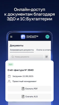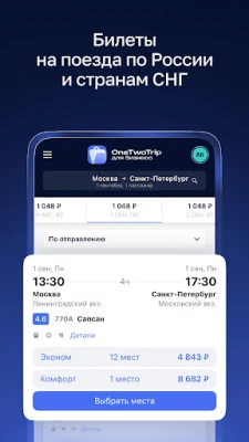Доступ к удобному личному кабинету в приложении. Скачивайте электронные билеты и маршрутные квитанции по командировкам сотрудников. Просматривайте свои жд и отельные заказы. Обращайтесь в службу поддержки 24/7 из приложения.