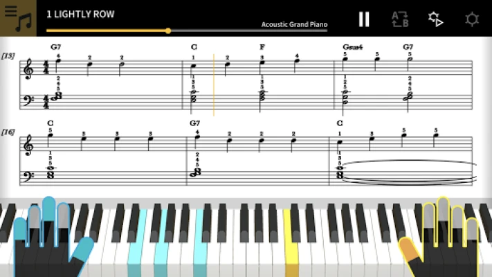 Bằng cách sử dụng bàn phím của ứng dụng hoặc bàn phím nhạc cụ được kết nối USB, bạn có thể luyện tập theo 3 bước của bài học cũng như đánh theo bảng tổng phổ và trình cuộn piano.