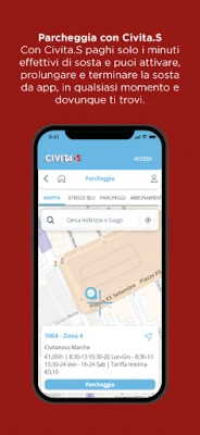 Niente più monete e code ai parcometri. Con Civita.S paghi solo i minuti effettivi di sosta e puoi attivare, prolungare e terminare la sosta da app, in qualsiasi momento e dovunque ti trovi. Riceverai una notifica quando starà per scadere il parcheggio e potrai decidere cosa fare semplicemente usando il tuo smartphone. L’App è collegata al sistema di verifica del gestore dei parcheggi e il controllo avviene direttamente sulla targa dell’auto.