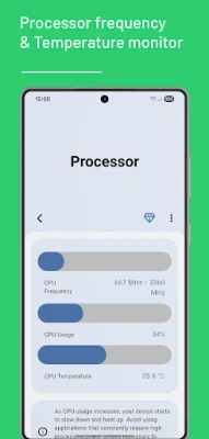 Keep a close eye on your device's hardware. View your processor's (CPU) frequency, real-time usage, and temperature to stay informed about the risks of overheating and performance degradation. Examine your memory (RAM) usage to identify which apps and services are consuming the most resources.
