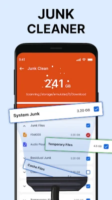 Phone cleaner giúp bạn quét các tệp rác khỏi bộ nhớ điện thoại. Tệp rác là các tệp tạm thời hoặc không sử dụng chiếm dung lượng lưu trữ trên thiết bị của bạn. Junk cleaner quét và hiển thị các tệp rác, APK cũ và các mục không cần thiết khác. Với junk cleaner, bạn có thể dễ dàng quét và dọn dẹp các tệp không mong muốn. Chỉ cần chọn những gì bạn muốn xóa và dọn dẹp bộ nhớ trên điện thoại của mình.