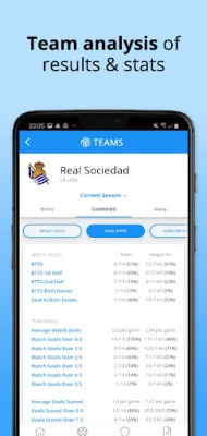 The app provides statistics and predictions for each game in a clear layout, covering all the key betting markets. These include: