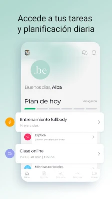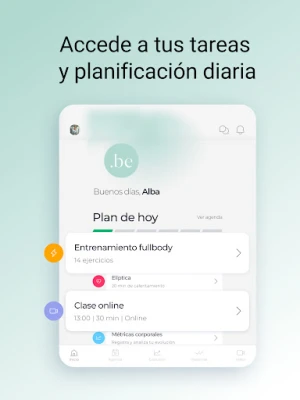 Desde .BE entrenamiento mujer, podrás acceder a tus sesiones de entrenamiento en streaming, realizar los ejercicios planificados por tu entrenador/a o consultar tus avances semanales, entre otras muchas cosas.