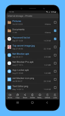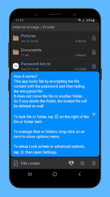File Locker allows you to manage files and prevent unwanted access to your private files with PIN, pattern or password lock.