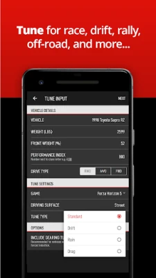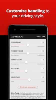 This tuning app gives you settings for many different situations. Create standard (street/track), drift, drag, rain, rally/snow, and off-road tunes with ease.