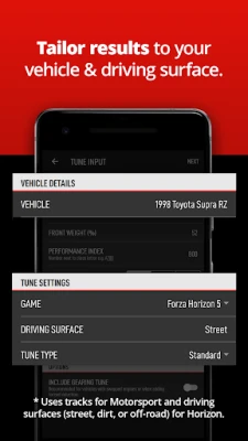 This pro version lets you tune by specific car and track/surface, and includes extra tuning types for Motorsport and Horizon. You also get an intelligent gearing calculator, the ability to save tunes, and finer control over your tune balance. These tunes are carefully designed to balance all of the values together. This is incredibly difficult and not something you'll find with other tuning options out there.