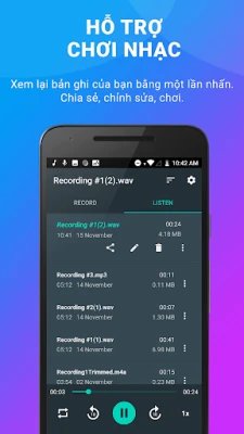 - Hỗ trợ play file ghi âm ngay trong ứng dụng với tốc độ chơi và chế độ Repeat...