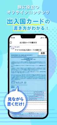 また、海外渡航時に迷いがちな出入国カードの書き方や、便利な通貨計算の機能を搭載。オフライン状態でも利用できます★