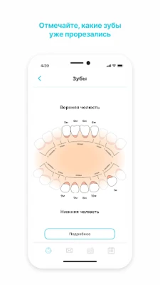 Наглядные индивидуальные графики роста и веса ребенка, схема прорезывания молочных зубов, списки произносимых слов, окна двигательных навыков, график посещения врачей и прививок – все это бесплатно в приложении!