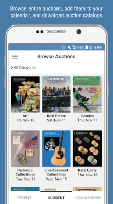 The new Heritage Auctions android app allows collectors to browse and find US & World Coins, Rare Currency, Fine & Decorative Art, Western Art, Illustration Art, Vintage Comic Books & Comic Art, Movie Posters, Entertainment & Music Memorabilia, Jewelry & Timepieces, Vintage & Couture Handbags, Sports Collectibles, Historical & Political Memorabilia, Rare Books & Manuscripts, American Indian Art, Air & Space Memorabilia, Civil War Memorabilia, Vintage & Contemporary Photography, Nature & Science Specimens, Fine and Rare Wine, URL domain names and other Intellectual Property, Luxury Real Estate and more.
