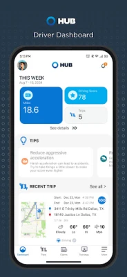 HUB Drive Safe helps improve your driving by using smartphone sensors to measure your driving behavior from trip origin to destination and score you against other drivers using the app. By taking training associated with identified behaviors, the app enables you to avoid behaviors that can contribute to accidents. In the event of an accident, HUB Drive Safe lets you and/or the company you are driving for notify your emergency contacts and initiate an insurance claim. Also, HUB Drive Safe allows your manager to set designated work hours so that they monitor your behavior only while you are working.