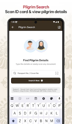 Scan Nusuk ID Card, Hajj Committee ID card, Steel bangle QR code, Ithraa Card, Cover Number on Bags, Passport Number, etc. and find the pilgrim details including the hajj pilgrim building number, all group members name and building number and room details. Other details include flight details. You can also share the details as an image to WhatsApp or other apps.