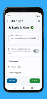 - Maak een foto van jouw identiteitsdocument. - Streep gegevens door die niet noodzakelijk zijn voor de ontvanger. - Vul in voor wie de kopie bedoeld is en waarvoor de kopie nodig is. Deze tekst komt met de datum als watermerk op de kopie te staan. - Vervolgens kun je de kopie versturen, printen of opslaan voor later gebruik.