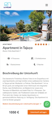 Erleben Sie einen unvergesslichen Urlaub mit La Palma 24, Ihrem perfekten Partner für die ideale Unterkunft auf der schönen Insel La Palma. Wir bieten eine exklusive Auswahl an Immobilien, von gemütlichen Apartments bis hin zu luxuriösen Villen, alle ausgestattet mit modernen Annehmlichkeiten und in den besten Lagen der Insel.