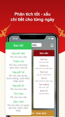Ưu điểm so với các ứng dụng xem ngày giờ tốt xấu khác: Có chấm điểm theo từng ngày cụ thể giúp người xem có thể dễ dàng hình dung được mức độ tốt xấu của ngày. Hơn nữa ứng dụng còn cung cấp các cách xem ngày chính xác cho từng năm sinh cụ thể. Lịch được viết dựa trên cuốn lịch Ngọc Hạp Thông Thư, có nội dung chính xác và đầy đủ Là tư liệu giúp cho gia chủ có thể tự xem và lựa chọn ngày giờ tốt Các tính năng khác: - Đổi ngày: Đổi một ngày bất kỳ từ Dương lịch sang Âm lịch và ngược lại, giúp tra cứu ngày nhanh hơn - Cung cấp đầy đủ văn khấn, kiến thức phong thủy, thờ cúng … vô cùng phong phú