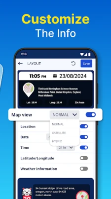 Chụp ảnh định vị và tự động lưu lại thông tin vị trí, địa chỉ cùng thời tiết. Mỗi ảnh chụp ảnh ngày giờ đều đi kèm bản đồ và thông tin cụ thể giúp bạn dễ dàng theo dõi. Camera ngày giờ hỗ trợ giao diện tùy chỉnh và dán nhãn rõ ràng.