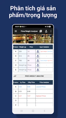 - Nhập giá sản phẩm và cân nặng để tự động phân tích giá cho mỗi 1g và giá cho mỗi 100g, đồng thời so sánh giá thấp nhất và giá cao nhất của sản phẩm.