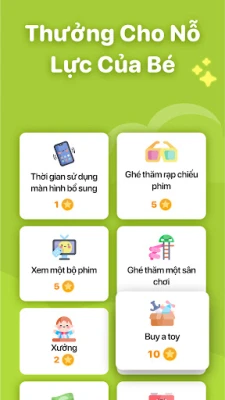 Hệ thống phần thưởng: Mỗi nhiệm vụ hoàn thành được chuyển thành điểm thưởng, có thể đổi lấy tiền tiêu vặt hoặc các phần quà nhỏ, qua đó khuyến khích trẻ làm việc có hiệu quả.
