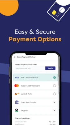 Pay for your dr booking or online doctor appointment with convenient payment methods like credit or debit cards, JazzCash or Easypaisa.