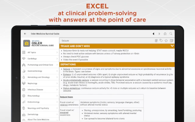 The Osler Survival Guide has been designed to meet the urgent need of time-strapped residents and clinicians. It serves as a practical reference for various clinical problems encountered during residency and in your medical career. This unique app carefully distills complex material into need-to-know information that is easily accessible and rapidly viewed helping health care professionals raise the standards of care and improve patient safety.