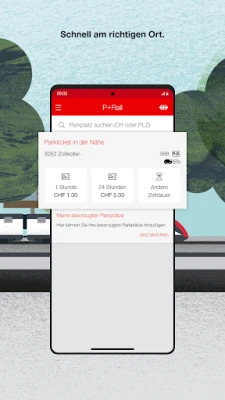 Mit der SBB P+Rail-App lösen Sie Ihr Parkticket schnell und bargeldlos. Die P+Rail-App vereint die SBB P+Rail-Parkplätze mit jenen der zehn Partnerbahnen (BLS, RhB, RBS, TPF, SOB, MGB, OeBB, AB, AVA und der Zentralbahn). Die Parkplätze von Parkingpay sowie eine Vielzahl an Parkplätzen von Gemeinden in der ganzen Schweiz runden das grösste Schweizer Parkplatzangebot in einer App ab.