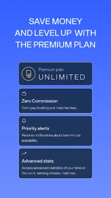 Once you join Premium, you can enjoy a limitless experience. Save money on every transaction and avoid additional court booking fees. Furthermore, you will receive personalized priority alerts. You will be able to select which notifications you want to receive according to your preferences so that you stay up to date on matches, courts, and last-minute opportunities. Your time is money, and it is valuable to us too!