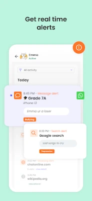 - AI-powered message and search alerts: Monitors and alerts for any suspicious browsing activity, or harmful SMS and social messages.
