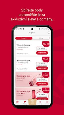 • Slevy za nasbírané věrnostní body - za každých 100 Kč získáte 1 bod. Za nasbírané body si můžete aktivovat v aplikaci slevové kupony. Získejte například 50 nebo 100 Kč na svůj nákup, slevu 10 nebo 15% na svůj nákup* a další speciální kupony.