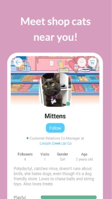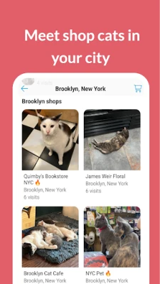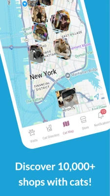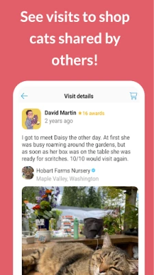 - Explore shop cats around the world on a map - Plan a trip to visit your favorite cats - Earn fun awards when you share your visits - Comment on and "scratch" visits that other users have shared - Become a top-ranked cat visitor in your city or by category - Meet cats at your next vacation destination - Support your local small businesses