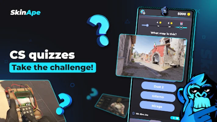 👉What sets Skin Ape apart from other apps of its kind? It's not just a way to get free CSGO (CS2) skins, but also a way to enhance your knowledge and skills related to CS GO. The in-app game quizzes allow you to delve into the details of the CS world. Additional coins earned for correct quiz answers motivate you to continually expand your knowledge.