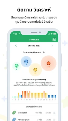 • แจ้งเตือนการทานยาไมเกรนแบบอัตโนมัติ: สามารถดูผลการใช้ยา แจ้งเตือนการทานยาเกินขนาด