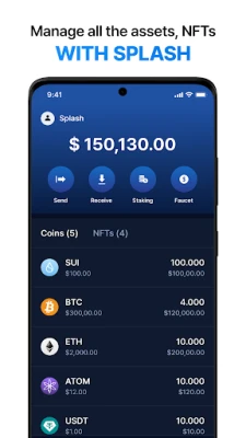 Splash Wallet mobile app is the easiest and safest way to get Sui test coins from a faucet, buy Sui NFTs, earn yield on crypto with staking or decentralized finance (DeFi), and access decentralized applications (dapps). Sui is more accessible and user-friendly than ever!