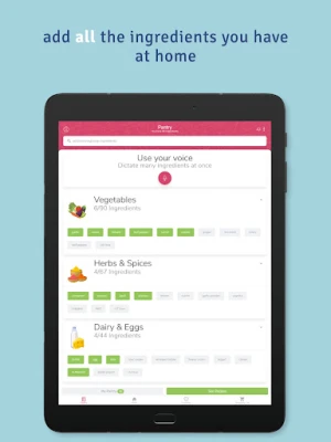Save time and money with an intelligent pantry. SuperCook’s voice dictation mode allows you to quickly add ingredients to your in-app pantry by simply saying them out loud.