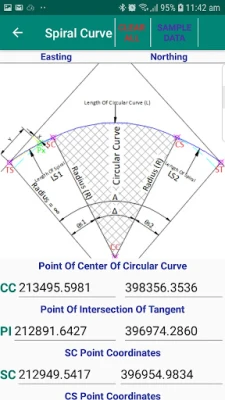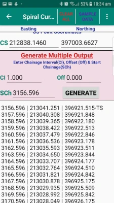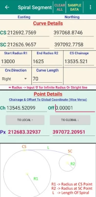 7. Spiral Curve Setting Out Calculator: The spiral curve setting out calculator program calculates the coordinate of the point within the group of transition or spiral and circular curve. Local Chainage & Offset <=> Global Easting & Northing vice versa. Also, this program can give multiple results for a given start chainage and an interval within the curve.