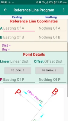3. Reference Line Program or Line and Offset Program: This program calculates Local Linear & Offset Distance <=> Global Easting & Northing vice versa. It is the most needed every day essential COGO program for land surveyors.