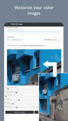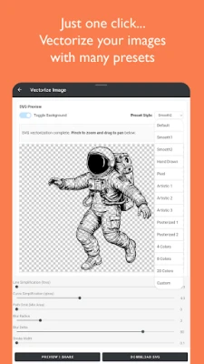 • Instant Vectorization: Convert any image to SVG format in seconds