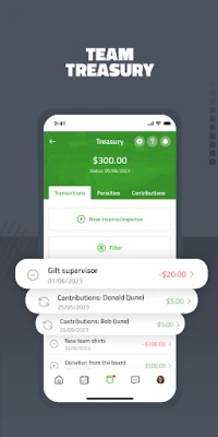 No more annoying lists to keep track of everything. Have all your transactions on hand at all times with the digital Team Treasury. You can also manage contributions, set penalties, and keep a penalty catalog.