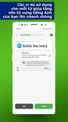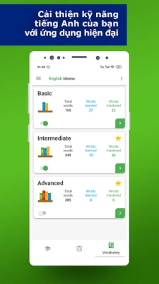 Kỹ thuật học, được áp dụng trong ứng dụng, cho phép bạn học các thành ngữ tiếng Anh, thường được sử dụng trong bài phát biểu tiếng Anh bản địa. Bạn có thể ghi nhớ tất cả những từ này một cách nhanh chóng bằng cách sử dụng ứng dụng xây dựng vốn từ vựng này.