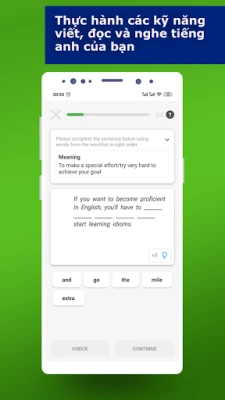 Có rất nhiều bài tập trong ứng dụng để ghi nhớ từ. Có cả "flashcard" với thành ngữ tiếng Anh từ trong phần đầu của bài học tiếng. Bạn có thể nghe cách phát âm chính xác, xem qua các định nghĩa và có đến mười ví dụ về cách sử dụng. Nếu bạn đã biết thành ngữ tiếng Anh, bạn có thể bỏ qua và tiếp thành ngữ từ tiếp theo. Sau đó, bạn nên vượt qua một bài kiểm tra để củng cố các thành ngữ từ đã học để xác định điểm yếu nhất của bạn. Trong phần thứ ba của bài học, bạn cần hoàn thành câu có chứa các thành ngữ từ đã học, sử dụng các từ theo đúng thứ tự. Bạn cũng có thể chọn mục tiêu trong ngày và theo dõi tiến trình của mình với giao diện thuận tiện. Để bạn có được kết quả cao nhất và không để bạn quên việc lặp lại, chúng tôi đã thêm các nhắc nhở.