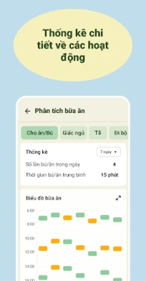 Thống kê ứng dụng Theo Dõi Bé: - Cho bé ăn - Bú mẹ - Giấc ngủ và tã của bé