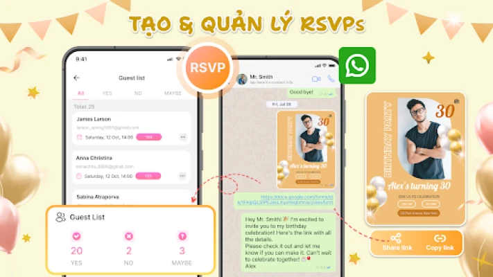 b>🔗Quản lý lời mời sự kiện & RSVP dễ dàng📨: Quản lý lời mời sự kiện và danh sách khách mời một cách dễ dàng qua liên kết Google Form. Gửi lời mời kỹ thuật số, theo dõi phản hồi theo thời gian thực và tổ chức danh sách khách mời hiệu quả. Mọi thay đổi về thời gian hoặc địa điểm sẽ được cập nhật ngay lập tức.