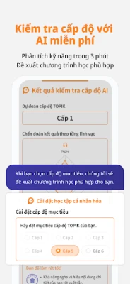 2. Bài kiểm tra trình độ AI nhanh chóng và dễ dàng ước tính điểm TOPIK của bạn và đề xuất chương trình học phù hợp với khả năng của bạn.