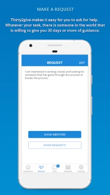 What is Thrity2give Virtual Mentoring? Very simply, Thirty2give is a virtual mentoring app that uses a smartphone to connect two people, a mentee, and a mentor, with the opportunity to commit 30 days to each other to share life-changing knowledge. It is the first smartphone app to facilitate authentic and collaborative mentoring virtual relationships. Driven by renewable 30-day cycles, the mentoring relationships are structured in a private environment that promotes a healthy and unobstructed transfer of knowledge, from a mentor who is eager to share to a mentee who is eager to learn.